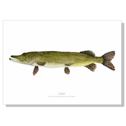 Fiskeplakat med 52 illustrationer af forskellige hyppigt forekommende ferskvandsfisk i Europa. I Danmark er gedden, skallen og aborren blandt de mest almindelige ferskvandsfisk, men der findes faktisk mange flere ferskvandsfisk i Danmark, hvorfor det kan være rart med en plakat med ferskvandsfisk til at artsbestemme. Illustrationerne har flotte naturtro farvenuancer og er udfærdiget med en stor detaljegrad, som gør det muligt at benyttes fiskeplakaten til at artsbestemme ferskvandsfiskene. Dertil er plakaten særdeles dekorativ i sig selv, og vil pryde ethvert hjem. Under hvert billede er navn (dansk, tysk, engelsk m.fl.) angivet samt fiskens størrelse og vægt.