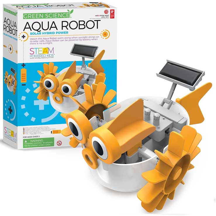 Kidzlabs er spændende og lærerigt legetøj der forener videnskab, leg og lærring. Aqua Robot benytter sollys til at skabe energi (fremdrift) ved hjælp af solceller. Vejledning på dansk medfølger. Fra +8 år. Specifikationer: Materiale: Metal/plastisk
