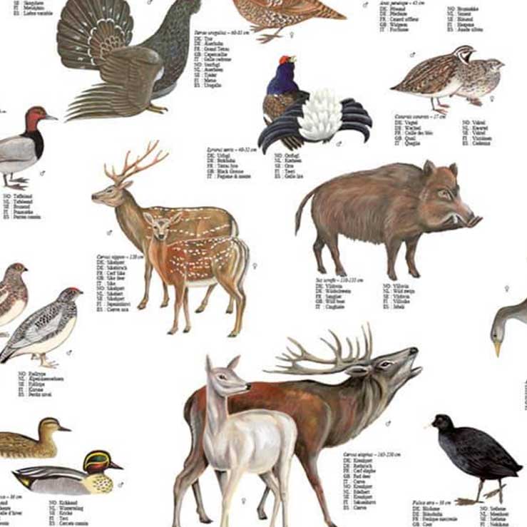 Plakat med en række almindelige fugle og pattedyr som lever i Norden. Dyrene er afbilledet i naturtro farvenuancer og med en høj deltaljegrad. Navnene er skrevet på dansk, engelsk, svensk, norsk og latin. Plakaten er trykt på et glansfuldt papir og er overfladebehandlet. Om plakaten Papir: 170 grams gloss Tegnet af: Erik Leenders