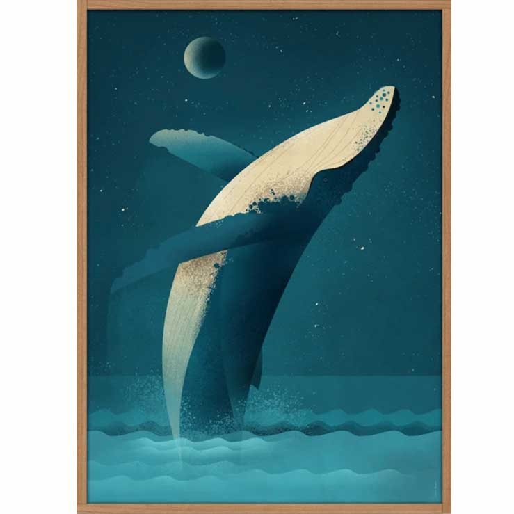 HVAL PLAKAT Pukkelhvalen tilhører bardehvalerne og bliver omkring 18 meter lang. Pukkelhvalen er særdeles aktiv i vandoverfladen, hvor den ofte kan springe op i luften. Hval plakaten er lavet af den anerkendte illustrator Dieter Braun. Dyrene er gengivet i naturtro farver og former i et spændende grafisk design. Specifikationer: 50 x 70 cm 250g uncoated offset paper 4C-offset printing