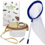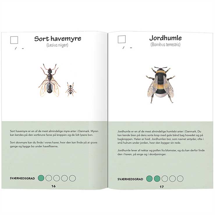 Insektsæt til børn – Insektbeholder, sommerfuglenet og min feltbog til børn Alt hvad du skal bruge for at udforske den flotte og mærværdige verden af smådyr. Insektbeholder Insektbeholder med pincet og fine detaljer så som rem, udluftningshuller og forstørrelsesglas. Med indbygget lufthulle og forstørrelsesglas er beholderen ideel til at studere insekterne fra nærmeste hold. Solidt sommerfuglenet Skaftet og rammen er lavet af aluminium, hvormed nettet er let og håndterbart for børn i alderen +3 år. Skaftet har indbygget teleskopfunktion så længden kan justeres efter behov, fra 46 cm til fuldt udtrukket 78 cm. Dertil har sommerfuglenettet en lang netpose, hvormed sommerfugle, humlebier, fluer med videre, skånsomt kan indfanges i nettet. Nettet er forstærket med et ekstra bånd (den blå kant) rundt langs rammen, der hvor slitagen typisk er størst. Netmaskerne er ganske små, så selv de mindste insekter kan indfanges. Netdiameteren er 35 cm. Et sommerfuglenet er en nødvendighed for ethvert barn der elsker natur, og nettet i kombination med et forstørrelsesglas/ insektglas er garanti for mange timers leg og læring. Min Feltbog 50 smådyr Feltbog med 50 forskellige og relativt almindelige smådyr i den danske natur. Nogle af dyrene kan findes i haven ved blot at løfte en krukke eller en træstub. Andre er mere sjældne, og for at finde dem må du væbne dig med tålmodighed og snilde. I bogen venstre hjørne er der et afkrydsningsfelt. På den måde kan børnene holde styr på, hvilke dyr de har fundet, og hvilke de fortsat mangler at finde. Det er tilmed angivet, med grønne cirkler i bunden, hvor sjældent dyret er. Perfekt underholdning og læring til aktive børn, skovbørnehaver eller i forbindelse med en tur i sommerhuset. Bogen måler 14×21,6 cm. Illustrationer af Jakob Sunesen.