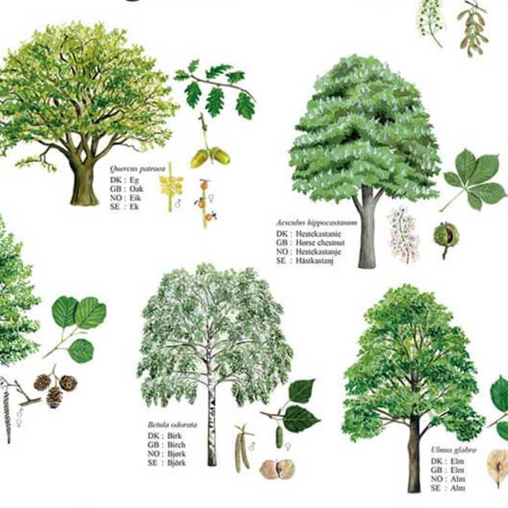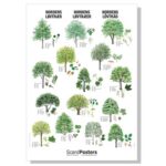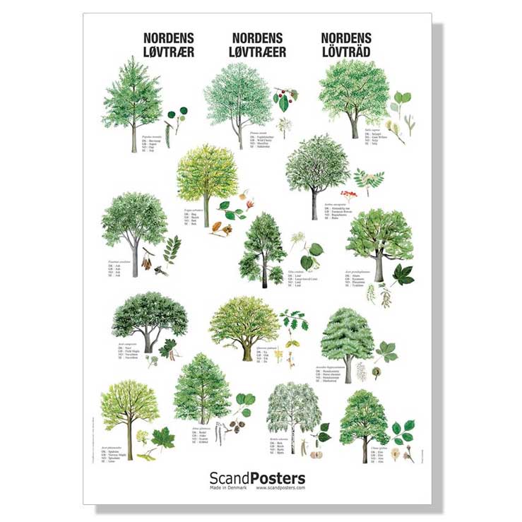 Plakat med 15 af de mest almindelige løvtræer i Norden. Træerne er afbilledet i naturtro farvenuancer og med en høj deltaljegrad. Ud fra hvert træ er træets blomst, frø, frugt etc. angivet. Dertil er navnet skrevet på dansk, engelsk, svensk, norsk og latin. Plakaten er trykt på et glansfuldt papir og er overfladebehandlet. Om plakaten Format 70×100 cm. Papir: 170 grams gloss Tegnet af: Lisbeth Olrik