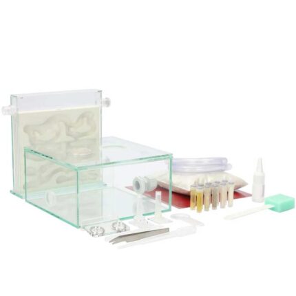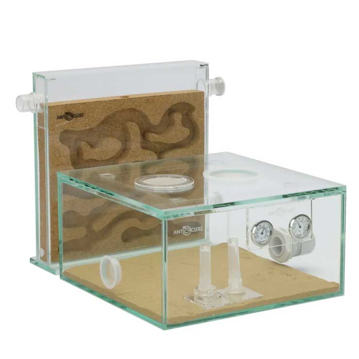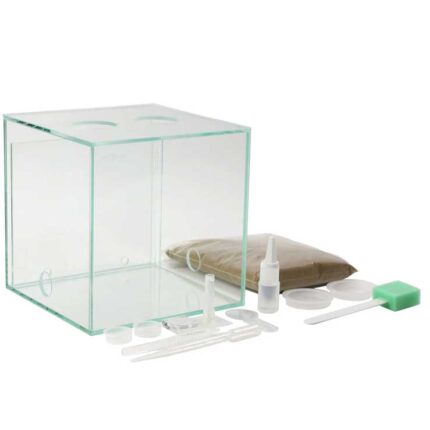 Startsæt til myrefarm med kork At passe en myrefarm er både fascinerende og lærerigt, og med dette startsæt er det tilmed nemt at komme i gang. Startsættet er velegnet til både børn og voksne, skoler og børnehave. Se video for introduktion. Indhold: 1x ANTCUBE – Arena 20x20x10x10 – flad 1x ramme til myrearena 20×20 1x dækning af myrearena 20×20 4x fastgørelsespunkt til arenaafdækning 1x ANTCUBE – myrefarm – L – 20×20 – stående 2x Formicarium plug 4mm 1x dækning af myretue 1x ANTCUBE – kork rede 20×20 – stående 1x 0,5 m rør transparent 14/10 mm 1x ANTCUBE – rød folie 20×20 – selvklæbende 1x Substrat – Sand-Loam beige – 1000g 1x gitterindsats – 50mm – rustfrit stål 1x Formicarium plug til 50mm hul 1x Formicarium plug til 27mm hul 1x gitterkappe – 16mm – rustfrit stål 1x tanktilslutning til 27 mm boring og 10-16 mm slange – M25 1x Formicarium-møtrik M25 – grå 1x drikketrug 2ml – 360 grader 1x foderdispenser 2ml – doserbar 1x Mini termohygrometer analogt – display – hængende 1x Beskyttelsesolie til beskyttelse mod myrer 10ml 1x pincet fjederstål – bred – blød 1x pincet plastik gennemsigtig 1x Plastpipette 3ml 1x Håndlup – 2x – 30mm 1x Food Mix Set – standard + svamp (11 dele) 1x skumtørrer 150x18x2,5mm