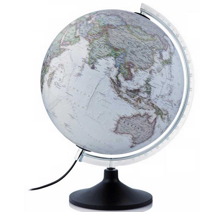 En smuk og mere stilren globus med nedtonede farver i hvid baggrund. Det indbyggede lys i globussen giver en hyggelig og inspirerende stemning i hjemmet. Specifikationer: Pære medfølger Forbrug: 13W Fatning: E14 Højde: 40 cm Diameter: 30 cm Ledning længde: 150 cm