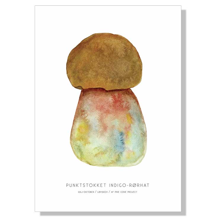 Flot og illustrativ naturplakat som afbilleder den danske spisesvamp Punktstokket Indigo-Rørhat. Billedet er håndmalet i akvarel farve, og trygt i svanemærket papir med vegetabilsk tryksværte. I bunden af billedet står oplysninger anført om svampens findested og sæson.