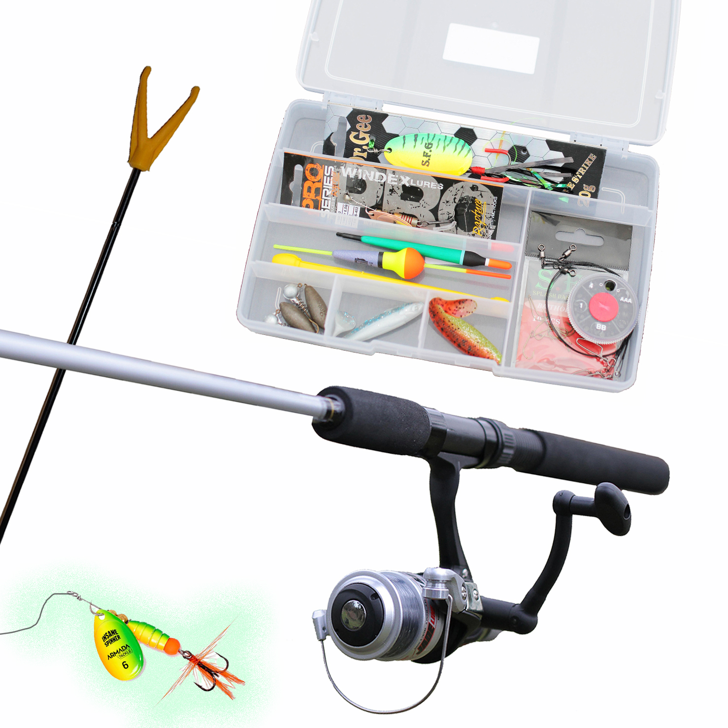 Sø fiskesæt til Børn Skrøbelige fiskestænger, plastik-hjul og billige blink – du kan finde meget børne fiskegrej på nettet, der har mere tilfælles med legetøj end reelt fiskeudstyr. I Naturlaboratoriet har vi derfor sat os for at sammensætte et solidt fiskesæt til børn, der i kvalitet og holdbarhed matcher fiskegrejet hos den erfarne lystfisker. Grejæske til sø Der findes flere spændende fisk i de danske søer, herunder aborre, skaller og gedder. Denne grejæske indeholder et bredere udvalg af endegrej, så du netop kan fiske efter alle de spændende fiskearter! Indhold af grejæske: 1 x Grejæske – Panaro Blinkbox str.L/7 1 x SFG Dr.Gee Spinder Str.6 /20g Fire Strike 1 x SFG Bruneret Baitholder Hook str 10 1 x Rapture Windex Spinner AG str.3 6,5g Kobber 3 x Mustad 7 Strand Wire Leader 1 x Gunki Box G´bump 8 Sunrise Shad 1 x Gunki Box Bumpy 7,6cm Snow Paradise 1 x Gul Plastik Krogløsner 2 x LF Jig Head Round Screw Krog str.1 / 4g 1 x Lineaeffe Master Floats 4g 1 x Splash Aborre/Skalle flåd 2.5g 2 x Dinsmores Miljø Blister Swivel Lod 14g 1 x Dinsmores Shot Dispensor 4 rum mini Trabucco fiskestang To-delt fiskestang fra Trabucco med en kastevægt på 10 – 30 gram, hvilket er den anbefalede vægt af den benyttede agn. Fiskestangen er modstandsdygtig overfor saltvand og kan således benyttes både i sø og hav. Med en overskuelig længde på 180 cm er fiskestangen særdeles håndterbar, og derfor ideel til børn og nybegyndere. Stangen er forsynet med neoprengreb, der giver et solidt og behageligt greb om fiskestangen. Hjul med påspolet line Solidt Vigor Jade fiskehjul med grafit hovedspole. Hjulet vejer blot 245 gram og giver derfor sammen med Trabucco fiskestang stor bevægelsesfrihed. Fiskehjulet er udstyret med en bremsering bagerst som nemt kan betjenes af børn.