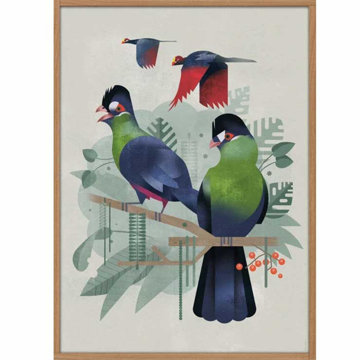 Den smukke turako er en trælevende fugle hjemmehørende i Afrika syd for Sahara. Fuglen har begrænsede flyveevner, men løber og hopper behændigt i trækronerne. Plakaten er lavet af den anerkendte illustrator Dieter Braun. Dyrene er gengivet i naturtro farver og former i et spændende grafisk design. Specifikationer: 50 x 70 cm 250g uncoated offset paper 4C-offset printing