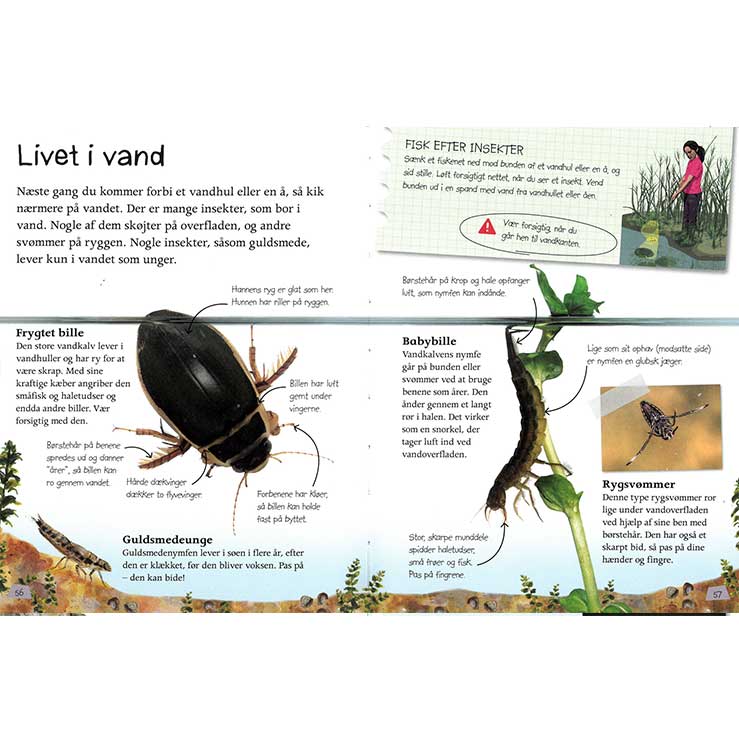 Ud i naturen – Insekter og edderkopper I Danmark findes der et utal af forskellige smådyr i utrolige farver og former. Og dyrenes mikroverden er faktisk temmelig forbløffende, når først du giver dyrene et grundigere eftersyn, eksempelvis med en lup! I denne bog lærer du om mange af de forskellige arter, og bogen rummer talrige illustrationer, aktiviteter og projektideer med smådyr som omdrejningspunkt. ’Ud i Naturen’ er en serie af bøger henvendt specifikt til børn. De er skrevet i et letforståeligt sprog og er tiltænkt børn +3 år. Bogen måler 15×20 cm.