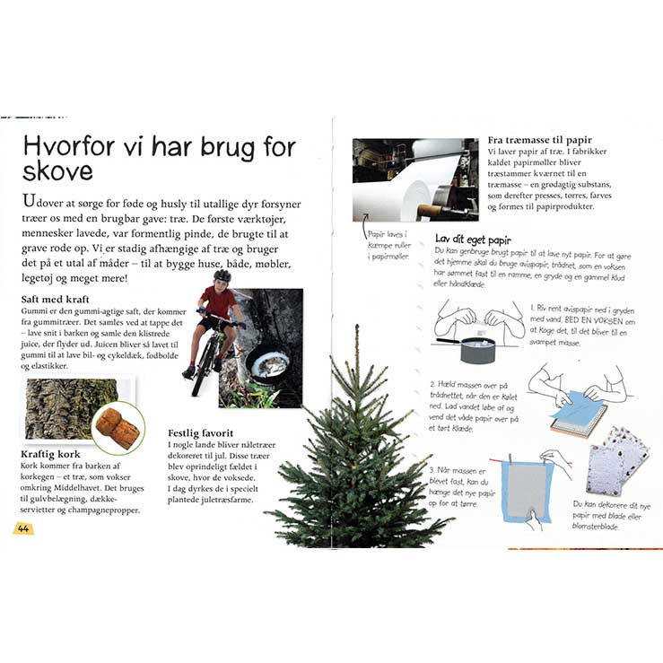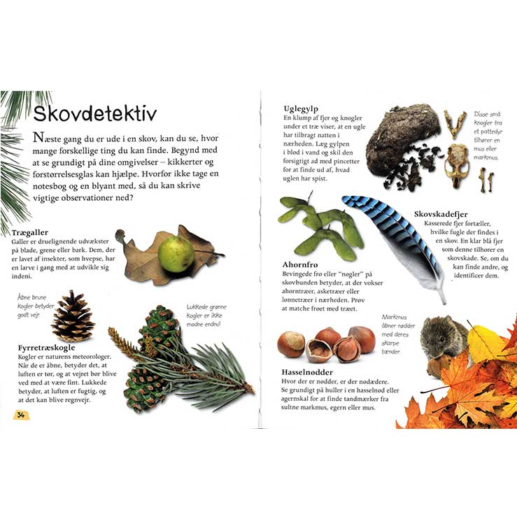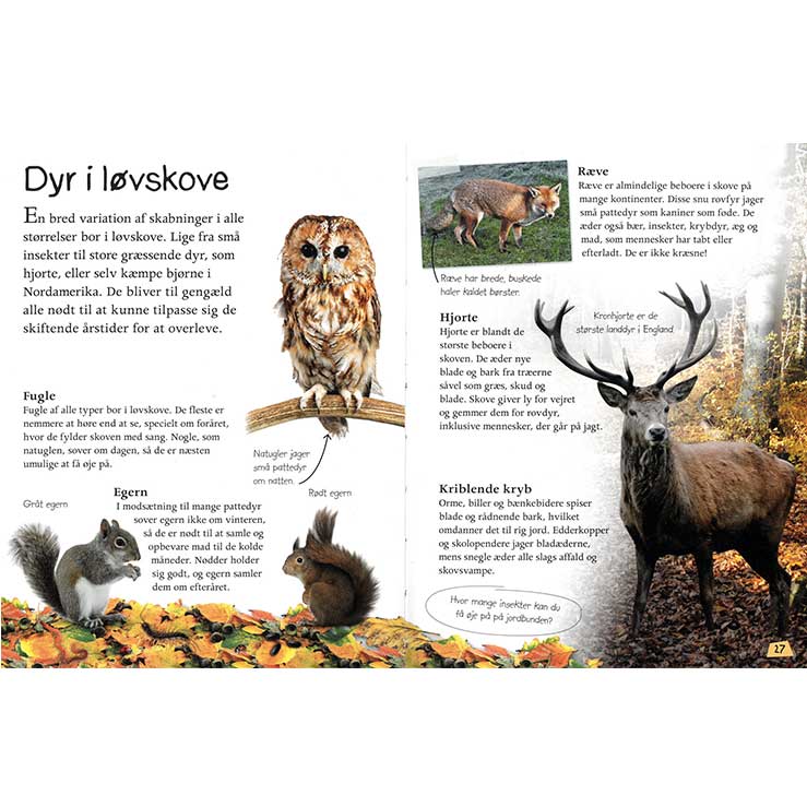 Ud i naturen – skoven I bogen ‘Ud i naturen – skoven’ kan du læse om skovens prægtige træer og de mange forskellige dyr som bor her. Bogen er således ideel til naturinteresserede børn og deres familier, der ønsker at blive klogere på livet i skovene. Bogen præsenterer et bredt udvalg af forskellige dyr der lever i skovene, så som egern, hjorte, ræve og spætter. Bogen har tilmed et detektivkapitel, hvor det handler om at finde forskellige ting i skoven, så som uglegylp, hasselnødder og fyrretræskogler. Og i bogen kan du læse om, hvad man bruger skoven til, og hvordan du kan være med til at hjælpe den. ’Ud i Naturen’ er en serie af bøger henvendt specifikt til børn, med naturen som omdrejningspunkt. De er skrevet i et letforståeligt sprog og indeholder talrige illustrationer og billeder. Tiltænkt børn +3 år. Bogen måler 15×20 cm.