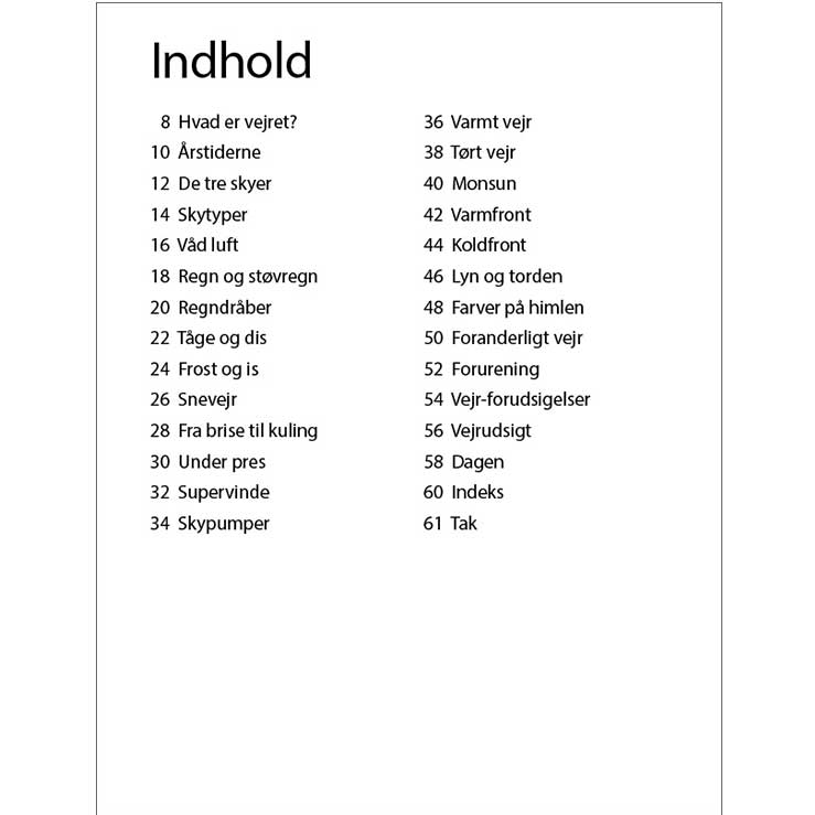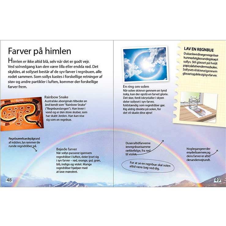 Ud i naturen – vejret Spændende børnebog om vejret. Bogen redegører for en masse interessante emner så som ‘hvad er vejret?’, årstiderne, monsun, skypumper, vejrudsigten, skytyper og meget mere. Bogen indeholder mange illustrationer, aktiviteter og projektideer med vejret som omdrejningspunkt. ’Ud i Naturen’ er en serie af bøger henvendt specifikt til børn, med naturen som omdrejningspunkt. De er skrevet i et letforståeligt sprog og indeholder talrige illustrationer og billeder. Tiltænkt børn +3 år. Bogen måler 15×20 cm.